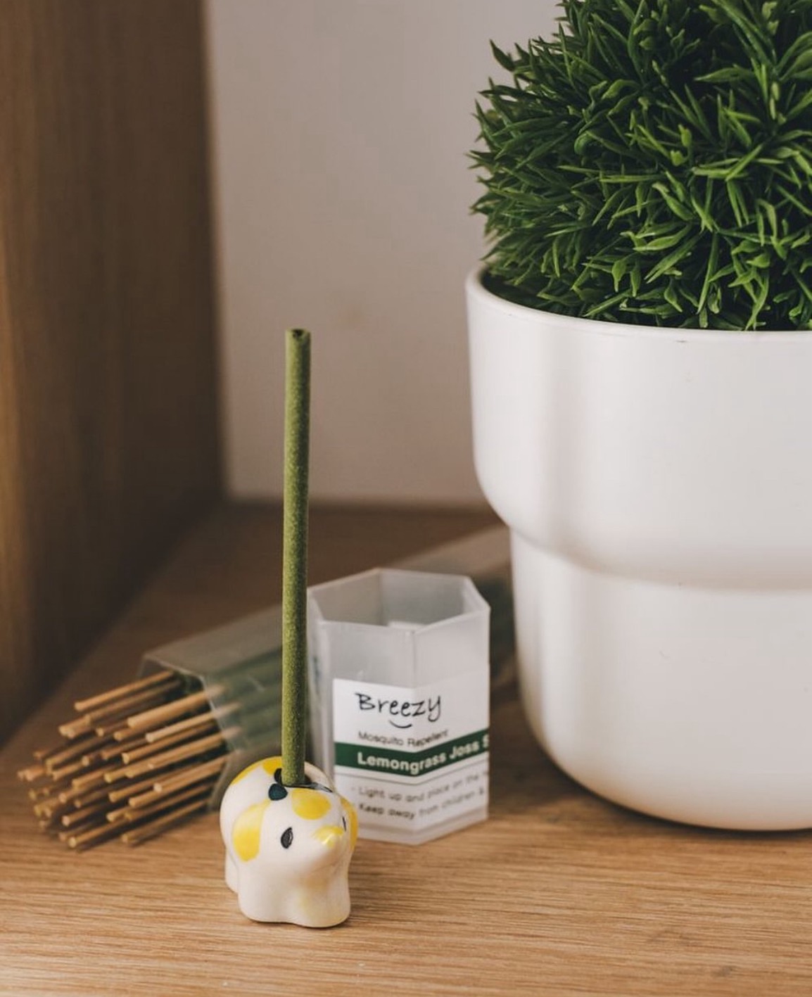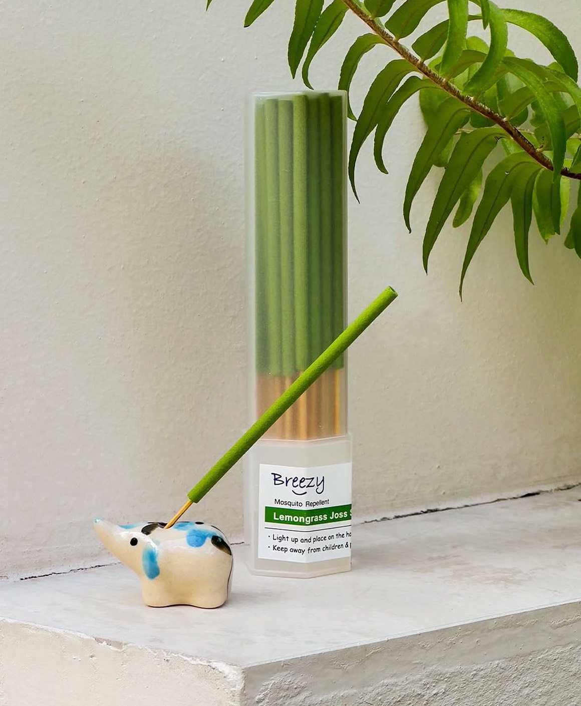 A small ceramic elephant is included for holding the incense stick.